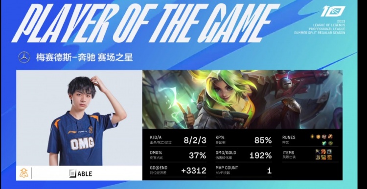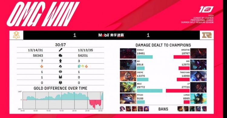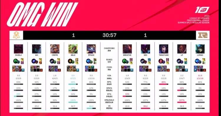 【30:08】OMG找到机会直接先手,AKi大树大招配合shanji奥恩大招给到控制,Creme琪亚娜推出一个漂亮大招!Tangyuan阿狸交出金身丝血先逃但是后排的LP卢锡安被Creme琪亚娜找到直接越塔就地击杀!正面Able泽丽配合队友集火击杀Breathe塞恩,OMG打出0换4!Wei卡兹克想断兵线但是正面还有一轮兵线在啊!OMG直接推家扳平比分!