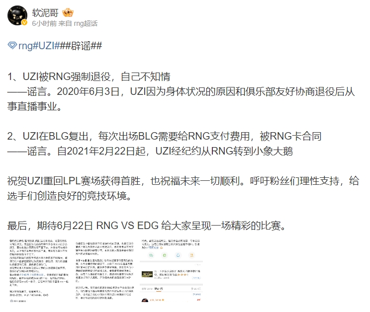 1.Uzi被RNG强制退役,自己不知情(网传RNG举办名人堂活动,Uzi未知情的情况下被强制退役一事) 是谣言。