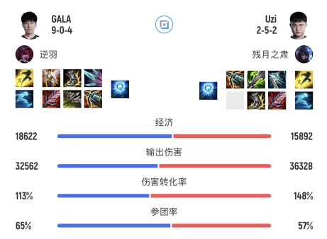 直播吧6月17日讯 在刚刚结束的比赛中,LNG击败EDG先下一城。在比赛中Gala前期抗压成功并且后期打巨额伤害,最终完美数据9-0-4。