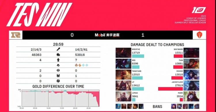 第一局比赛Wei卡兹克3级帮中让Tangyuan安妮收下一血!RNG控下两条先锋,TES则是控下两条小龙!JackeyLove厄斐琉斯下路打出线杀,又在团战中不断收获击杀实现无解发育!TES中期开始发力,先是视野给到RNG很大压力,随后击杀Breathe塞恩之后收下大龙!关键的龙魂团JackeyLove厄斐琉斯把自己当前排伤害拉满+金身规避斩杀成功不死超神!TES成功团灭RNG,从下路一波收获首局比赛的胜利!