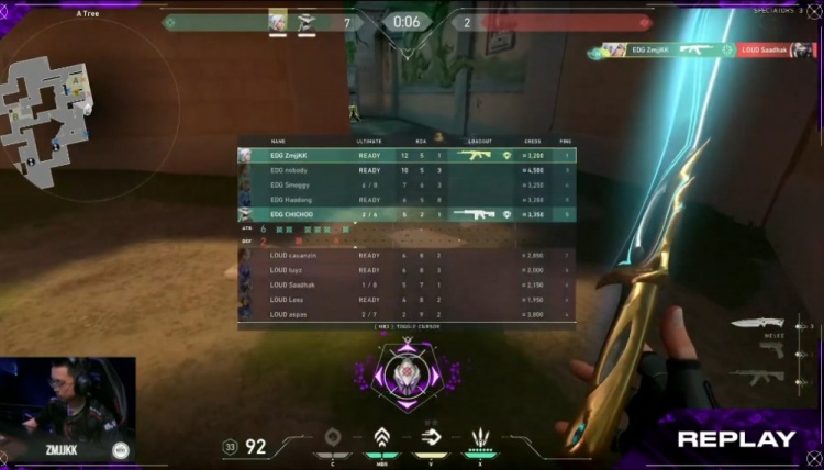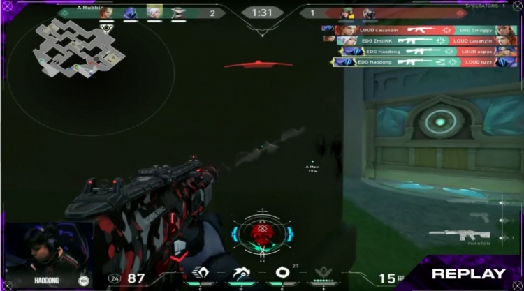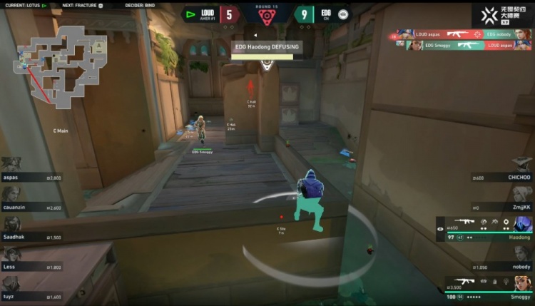 【第三局】长枪局,康康在A大被架死,EDG只能转C,完全进不了点被aspas完全架死。EDG 2-1 LOUD