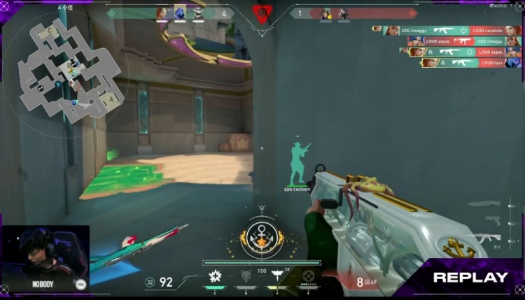 【14局】EDG没钱选择纯E,aspas滑铲进点击杀康康,aspas包点再打一个,nobody绕后手枪连偷两个捡到AK,切AK再打两个包点,队友再捡枪打赢最后的一打一。nobody四杀帮助EDG完成翻盘。EDG 9-5 LOUD