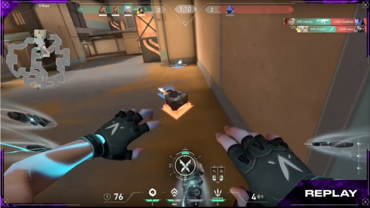 【9局】开局Haodong利用技能秒掉A大的aspas,EDG在B区前顶信息拉满,LOUD被迫打A,EDG开大拖时间不给下包,LOUD选择强行下包全部被架死。康康大狙收到双杀。EDG 4-5 LOUD
