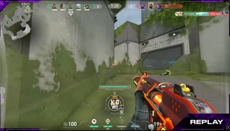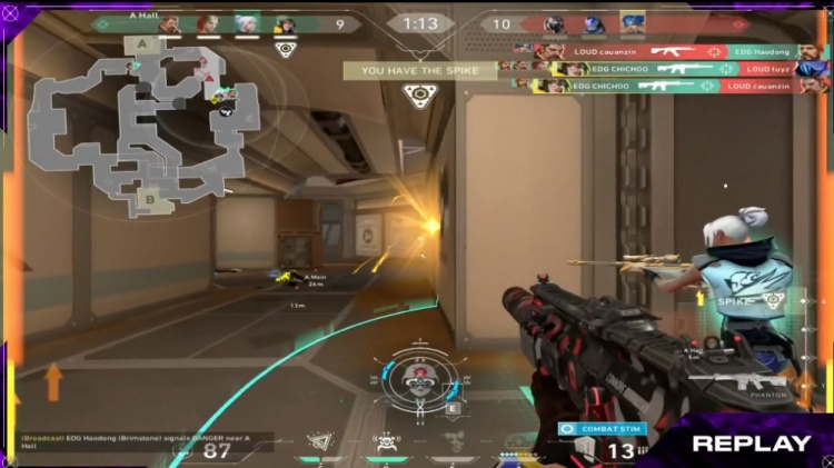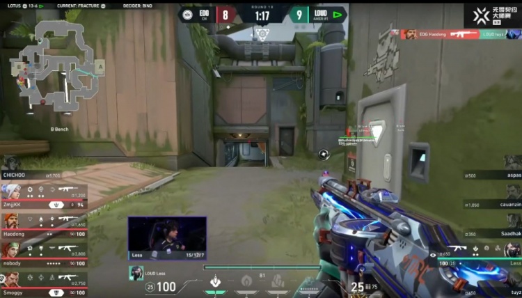 【18局】开局LOUD选择三人B大前顶,EDG完美的闪光配合完成0换3,EDG进包点一换一轻松下包。EDG 9-9 LOUD