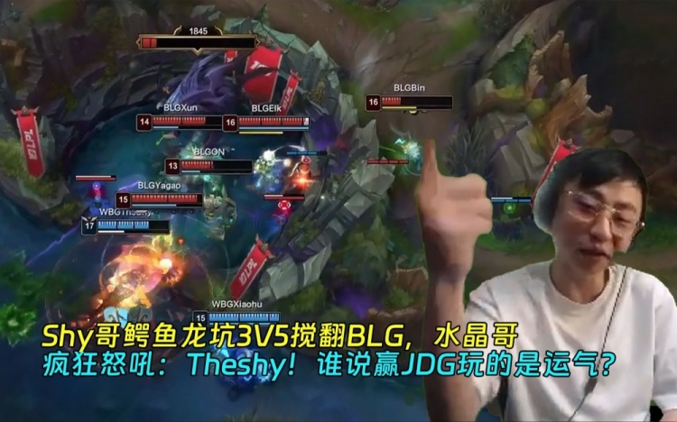 直播吧6月25日讯 在2023LPL夏季赛常规赛W4D6的第三局比赛中,BLG 2-1战胜WBG。在首局比赛中,TheShy操刀鳄鱼龙坑3V5搅翻BLG,开播解说比赛的水晶哥直接疯狂怒吼:“TheShy!谁说赢JDG玩的是运气?”