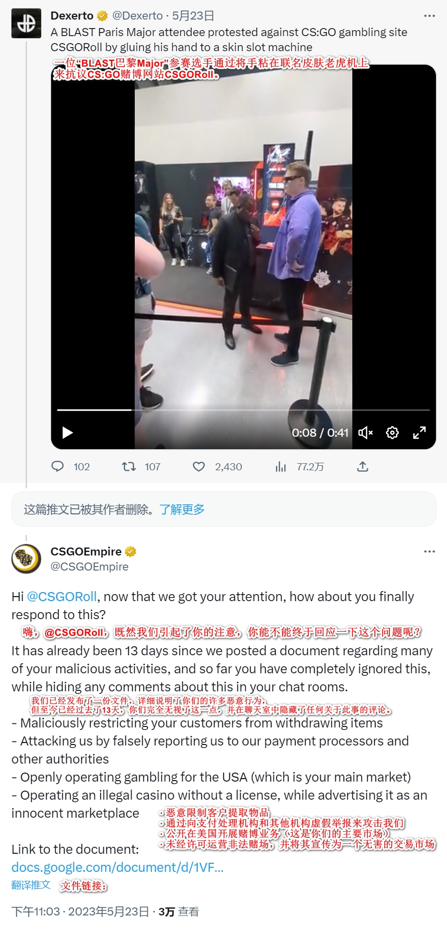 在6月28日当天,另一家与"CSGO Roll"竞争的赌博网站"CS:GO Empire"公布了一份CS:GO交易者名单,声称这些用户涉嫌通过"CSGO Roll"进行了"非法加密货币洗钱"。同一天稍晚,名单上的账号全部遭到封禁,目前还无法确认这两者之间的关联。