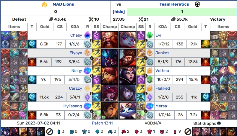 (本场比赛Jankos和中单两人合砍18人头,Evi操刀波比1-7-12算是混了一局)