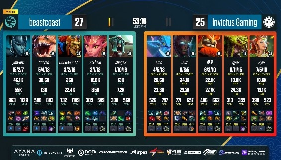 首局较量,前期iG三路线优节奏完美,中期Dust恐怖利刃控盾带队推进先破BC两路高地,绝境之下,BC一号位幻刺祭出圣剑背水一战并完成翻盘,iG首局饮恨败北。