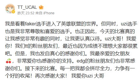 直播吧7月5日讯 LPL夏季赛TT让一追二战胜EDG,赛后中单Ucal发博:看着Faker玩的联盟 我爱你Uzi大哥