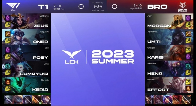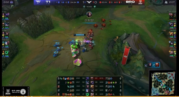 首局双方节奏缓慢,听牌龙才第一次打团,T1借助Zeus贾克斯回马枪晕两个收到三杀,打出0换3先收大龙!但是Poby乐芙兰中路带线被抓阻止了T1的这波推进,Karis沙皇大招准确单防Zeus贾克斯帮助队伍先拿风龙魂,再rush掉大龙,绕后留人的Zeus被集火再次阵亡!比赛进入后期,BRO的双C已经成型,远古龙团UmTi蝎子拉回Oner猪妹将他秒掉,随后乐芙兰和洛互换,多个人的BRO拿下远古龙,三龙汇一波拿下首局比赛!