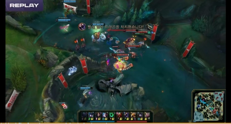 【24:58】Morgan酒桶TP先到,BRO拿下听牌龙,后续团战Oner猪妹留人被打成丝血捡灯笼逃生,Zeus贾克斯第一次进场被沙皇推回,Hena厄斐琉斯输出拉满!但是UmTi蝎子想追人被卡住距离,回头Zeus贾克斯风扇一开晕两个拿下三杀!T1打出0换3!收下大龙!经济优势7K!