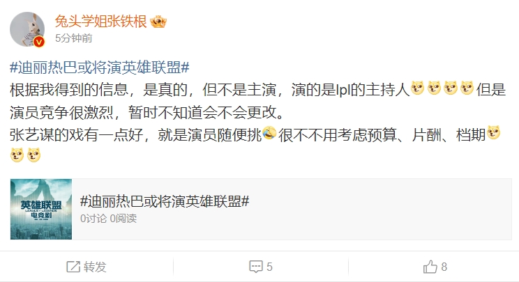 直播吧7月28日讯 近日有博主爆料,由张艺谋担任导演的《英雄联盟》电竞真人剧,迪丽热巴将参演该剧,将饰演LPL女主持人,且并非主演。