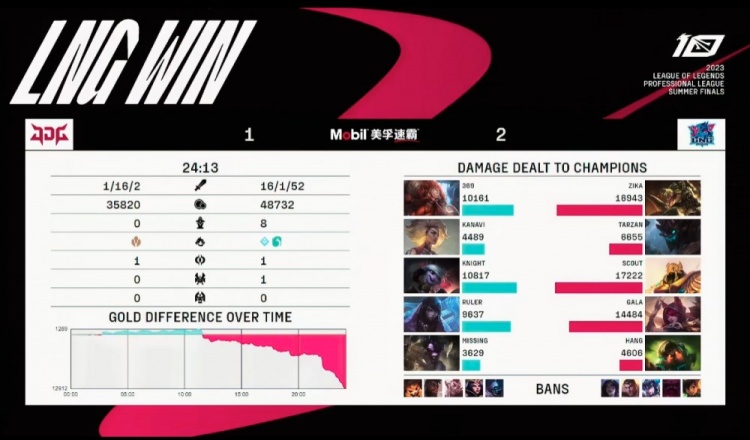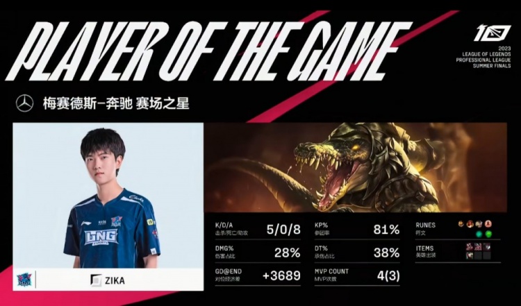 第三局前期Kanavi芮尔3级抓下,ruler拿到Gala一血。后续小龙团Gala霞拔矛控三人,Zika鳄鱼与Scout沙皇联手出击,LNG打出0换3。中期JDG下路推进,Zika鳄鱼无人能挡,Scout带掉JDG上路二塔,LNG收掉第二条小龙。大龙团战JDG难以招架,Kanavi被卖,LNG收掉大龙打出0换4,经济优势来到8K。后期LNG下路推进一波推平JDG基地拿到赛点。