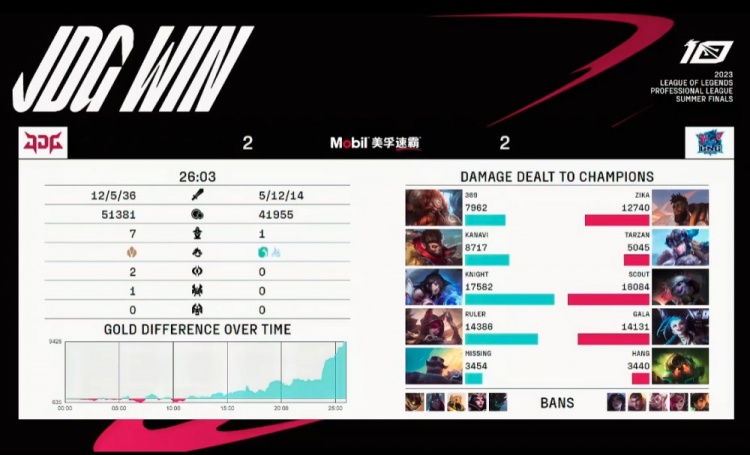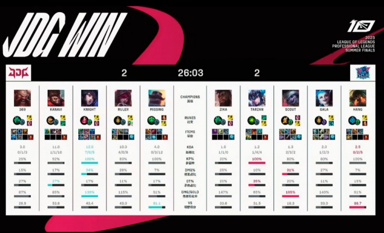 蓝色方JDG:369酒桶、Kanavi猴子、knight狐狸、ruler霞、Missing布隆