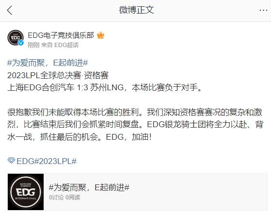 直播吧8月6日讯 LPL世界赛资格赛EDG不敌LNG错失以三号种子身份晋级世界赛的机会,赛后EDG更博:“很抱歉我们未能取得本场比赛的胜利。我们深知资格赛赛况的复杂和激烈,比赛结束后我们会抓紧时间复盘。EDG银龙骑士团将全力以赴、背水一战,抓住最后的机会。EDG,加油!”