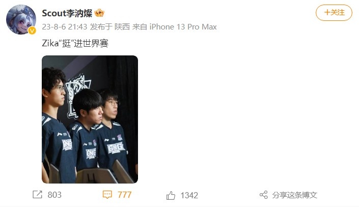 赛后LNG中单选手Scout发布一张照片,并配文:Zika“挺”进世界赛!