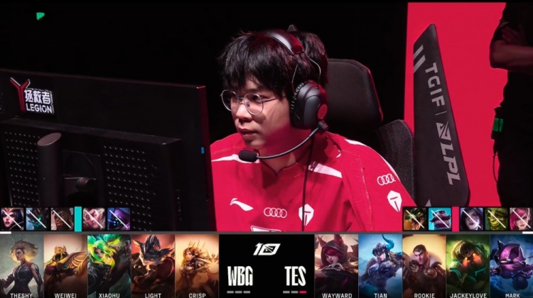 红色方TES:Wayward凯南、Tian猪妹、Rookie杰斯、JackeyLove霞、Mark泰坦