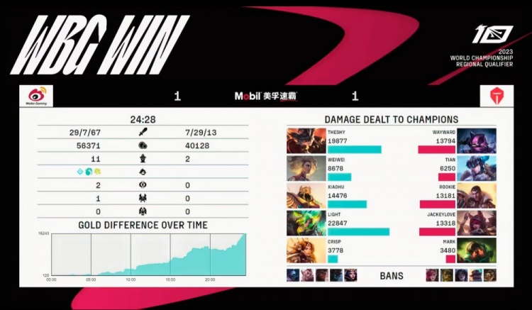 【23:32】WBG中路推进冲上TES高地,TES无力防守,WBG打出1换4,一波推平TES基地扳回一城。