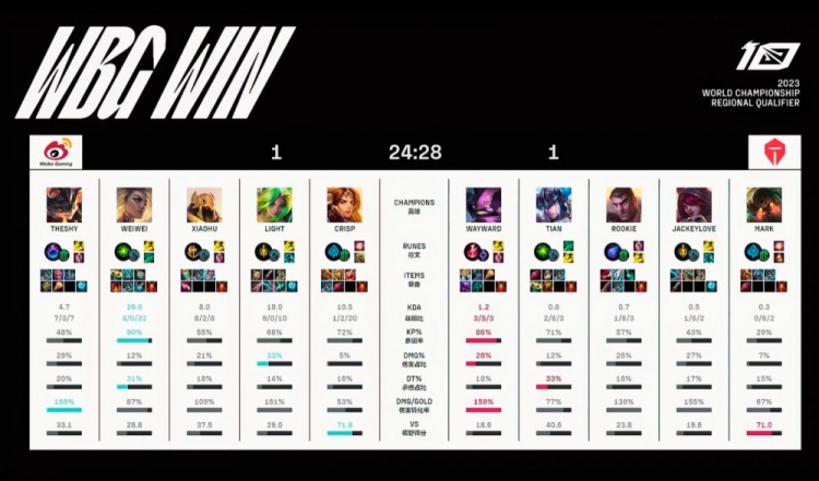 蓝色方WBG:TheShy兰博、weiwei芮尔、Xiaohu沙皇、Light泽丽、Crisp女坦
