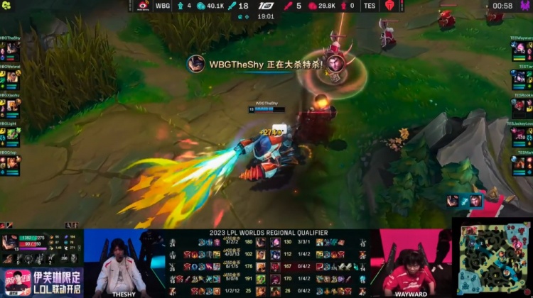 【18:54】杰斯与兰博上路单挑,兰博又烤又烧单杀杰斯,随后TES支援到位击杀兰博,WBG下路四人推掉TES水晶。