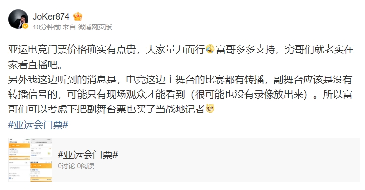 刚刚解说JoKer更新微博透露:电竞这边主舞台的比赛都有转播,副舞台应该是没有转播信号的,可能只有现场观众才能看到(很可能也没有录像放出来)。所以富哥们可以考虑下把副舞台票也买了当战地记者