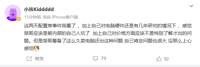 “这两天配置单事件我看了 ,加上自己对电脑硬件还是有几年研究的情况下 ,感觉桀哥应该是被内部的自己人坑了 加上自己对价格方面应该不是特别了解才出的问题。但是桀哥筹备了这么久卖电脑还出这种问题 自己肯定问题也很大 没那么上心感觉”