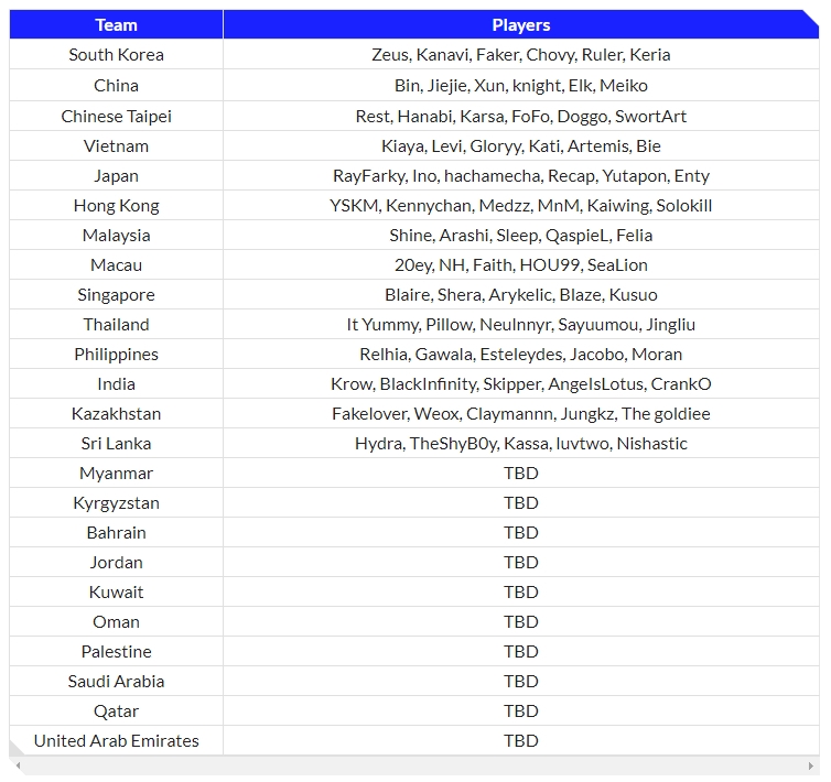 直播吧8月18日讯 目前已确认大名单的亚运会英雄联盟参赛队伍有:中国队、中国台北队、中国香港队、中国澳门队、韩国队、越南队、日本队、马来西亚队、新加坡队、泰国队、菲律宾队、印度队、斯里兰卡队、哈萨克斯坦队。