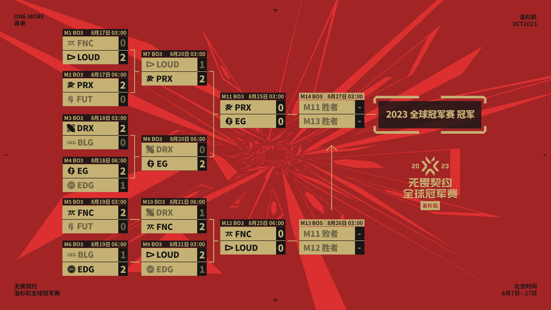 伴随着小组赛阶段于北京时间8月14日结束,此次洛杉矶全球冠军赛的淘汰赛阶段于北京时间8月17日正式开启。来自太平洋赛区的PRX、DRX,来自美洲赛区的EG、LOUD,来自EMEA赛区的FNC、FUT,以及来自CN赛区的EDG、BLG,合共八支队伍晋级淘汰赛,其中,CN赛区作为新晋赛区,两支中国队伍进入淘汰赛后的表现尤为引人关注,他们的每一步都可能创造历史。