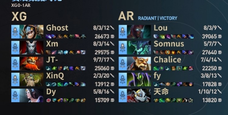 第一局较量,前期超哥无解肥黑鸟选择出点金手导致AR中期战力严重不足,一度经济落后将近1W,好在关键团战Lou恐怖利刃挺身而出,连续触发暴击点死Ghost无解肥小鱼人逆转局势,后期查理斯熊猫酒仙开大化身拆迁机器,AR无伤破掉XG两路高地后成功完成翻盘!