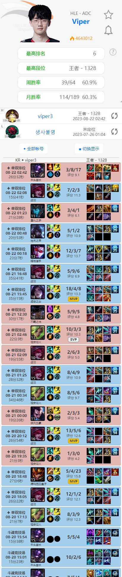S11冠军AD,现HLE下路Viper在近一周内打了64把排位,昨晚更是奋战到深夜,目前已经来到了韩服第六的位置。