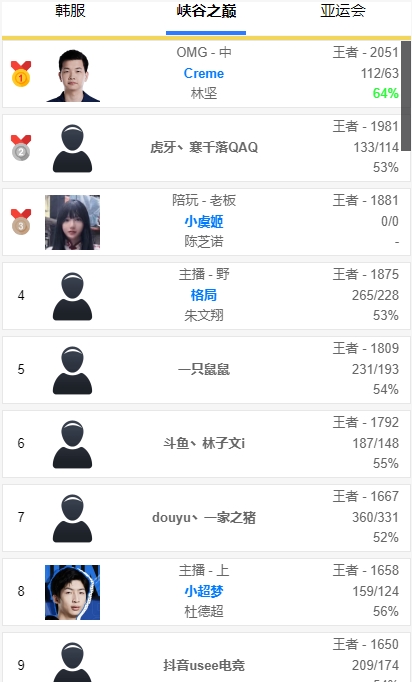 直播吧9月1日讯 今日OMG中单选手Creme国服峡谷之巅排位以王者2051点成功登顶第一!