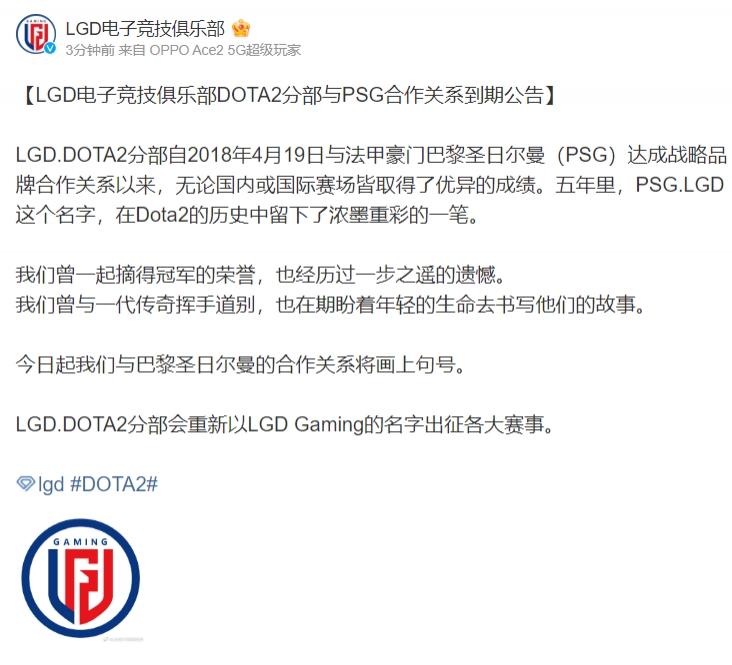 【LGD电子竞技俱乐部DOTA2分部与PSG合作关系到期公告】