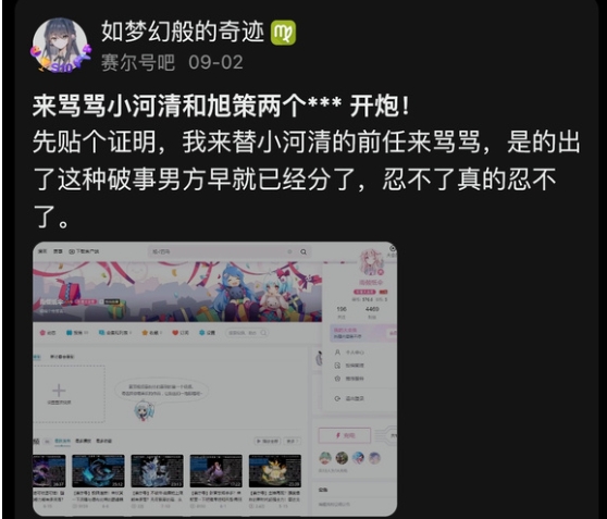 第一个重量级帖子来自于“晓和清”谈了七年男友的朋友,七年前男友的朋友怒骂了陈鹏旭(现赛尔号策划),并声明“晓和清”是女的无疑