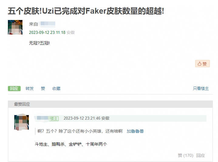 直播吧9月13日讯 昨日LPL官方公布了十大选手系列炫彩皮肤(国服特供),其中传奇选手Uzi拥有两个VN的皮肤,网友们发现至今Uzi在各类游戏上的皮肤已经有五个,全面领先GOAT、三冠王——Faker。
