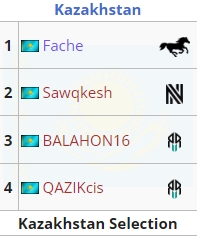 中亚+南亚区域决赛的第一是哈萨克斯坦代表队,队内四位选手仅Fache能在查询到效力于职业俱乐部——SLY Machine,位置隶属于突击手,生涯成绩一般。