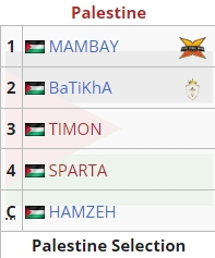 西亚区域决赛的第一是巴勒斯坦代表队,队内四位选手有两位(MAMBAY、BaTiKhA)效力于《PUBG》职业俱乐部。MAMBAY选手职业生涯成绩不佳,辗转于多家战队混迹于各种小杯赛;而BaTiKhA选手此前效力于NASR Esports,生涯最好的成绩是在2022维佐锦标赛拿下冠军,但目前没队自由人状态。