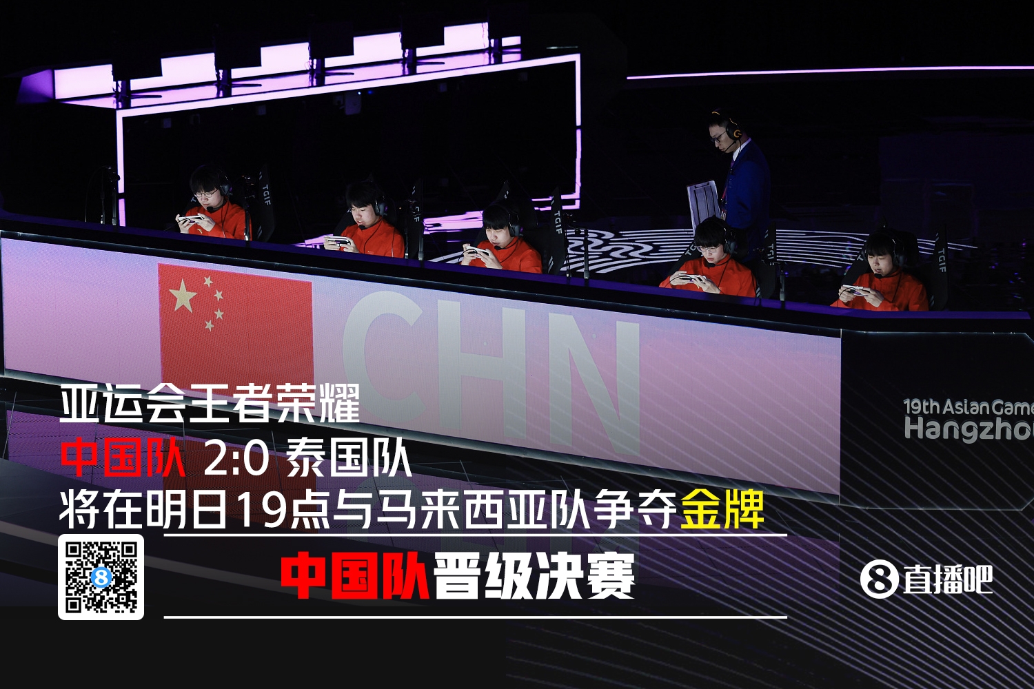 直播吧9月25日讯 在今日的杭州亚运会王者荣耀项目上,中国队以2-0的比分击败泰国队,顺利晋级决赛,将在明日晚上19点与马来西亚队展开金牌争夺。