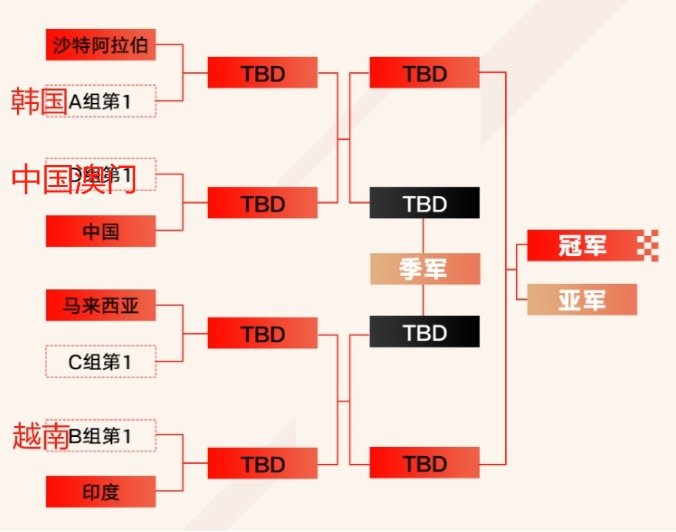 根据赛事抽签规则,D组第一的中国澳门队将会在淘汰赛阶段遇上中国队。