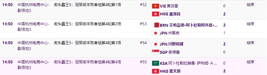 直播吧9月26日讯 今日杭州亚运会街霸5项目败者组第4轮比赛已经全部结束,根据杭州会官网显示,获胜者分别是:黃育祥(中国香港)、艾哈迈德·阿卜杜勒阿齐兹·阿卜杜拉 巴赫卢勒(巴林)、川野将輝(日本)、葉文豪(中国香港)。