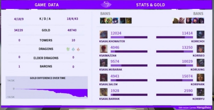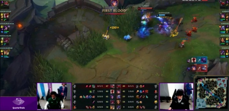 首局比赛开局双方打的较为平稳,Chovy中单小炮实现对位压制!韩国队借助沙特阿拉伯队在下路放先锋的一波4打4团战大获全胜之后直接将经济差拉开到7K!随后的比赛韩国队趁势追击,Kanavi莉莉娅不断收获击杀,虽然沙特阿拉伯队打野盲僧抢到了大龙!但后续交战韩国队直接送给沙特阿拉伯队一波2+3的团灭,成功拿下首局!