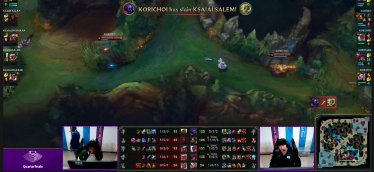 【17分钟】中路韩国队打出0换2之后推掉中路高地,回头Zeus贾克斯单人拉扯等到Chovy永恩TP支援击杀掉了泽丽!后续还在打,刚复活的沙特阿拉伯上单俄洛伊在下二塔处又被送回了泉水!韩国队想一波了!虽然沙特阿拉伯众人复活想守,但是韩国队抱团拉扯,Chovy永恩满血支援赶到配合队友反击收割,再次一波1换3之后韩国队击败沙特队,晋级四强等候中国队!