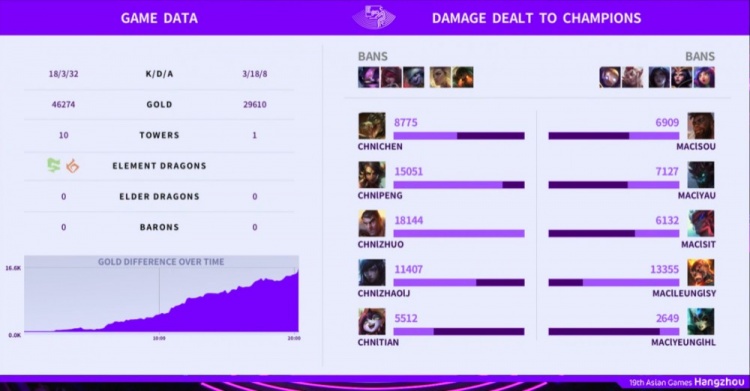 第二局中国队进行人员调整,彭立勋替换赵礼杰登场。前期虽然彭立勋下路gank失误送出一血,但他依然凭借出色的发挥使用豹女盘活中国队三路,中国澳门队下路火男+娜美的组合没能发挥效果。仅12分钟中国队经济优势来到1W以上。后期中国队下路利用二先锋一路冲上中国澳门队高地,随后中国队又拆掉中国澳门队中路水晶,一波顺利推掉中国澳门队基地,以2-0的比分拿到比赛胜利,他们将在明天的比赛中对阵韩国队。