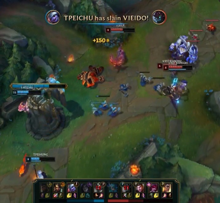 【17:02】卡莎来到下路与奎桑提一同联手绞杀格温。随后卡莎下路推塔,杰斯TP绕后,中国台北队小炮TP到下路帮助卡莎拆掉越南队下路二塔,随后中路开战,豹女瞬间双杀,卡莎带走格温,中国台北队打出1换3,经济优势来到7K。