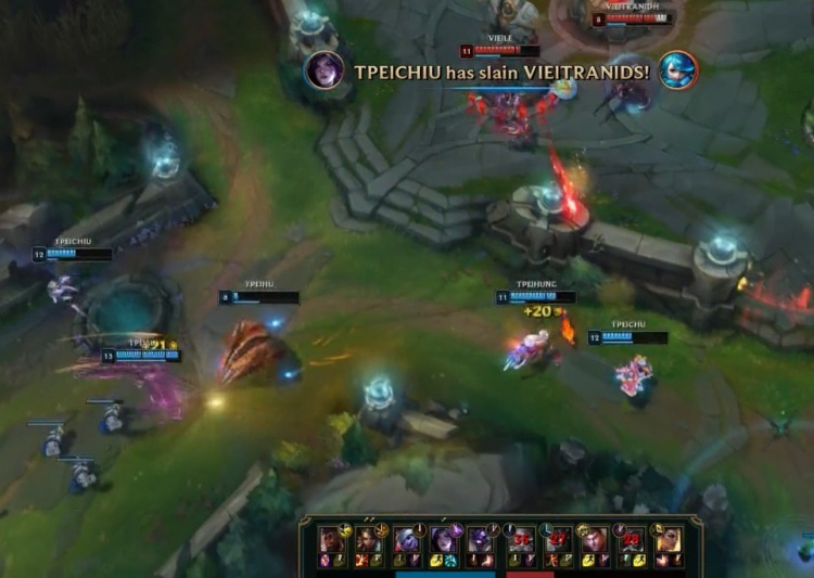 【13:22】中国台北队上路继续四包一,越塔强行击杀越南队格温,随后小炮拆掉越南队上路一血塔。中国台北队经济领先3K。