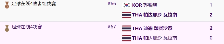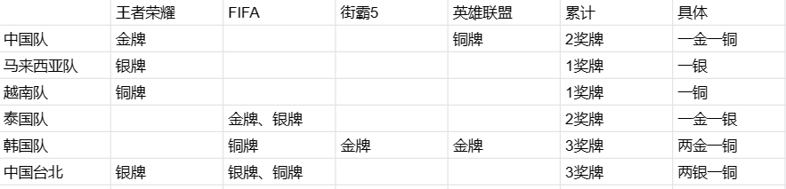 目前电竞项目的比赛已经过半,四个项目结束后,目前韩国队和中国台北队在电竞累计收获3枚奖牌并列第一,中国队则是与泰国队累计收获2枚奖牌,并列第三。
