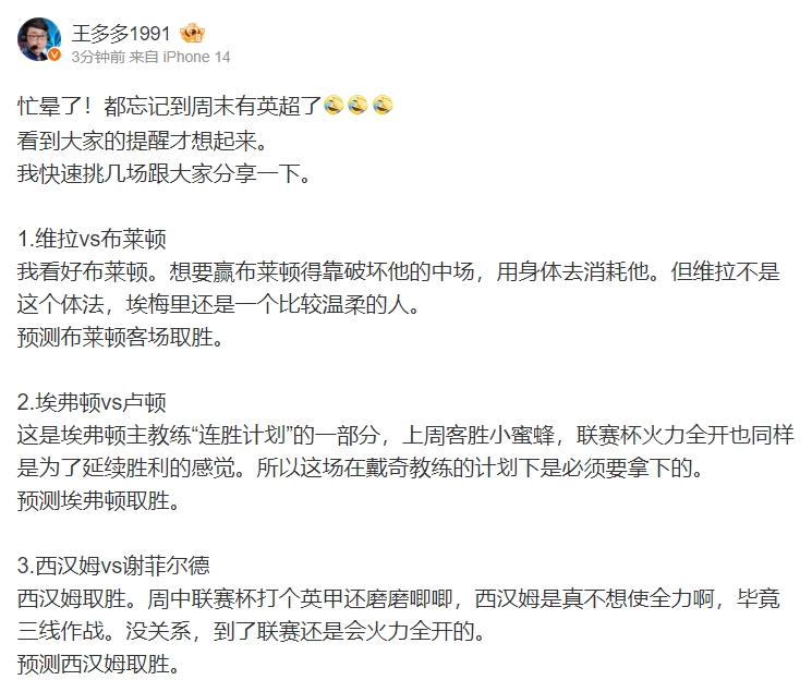 直播吧9月30日讯 今日英雄联盟职业解说、咪咕足球嘉宾解说——王多多更博预测了本周末英超五场比赛的胜果以及比分,详情如下: