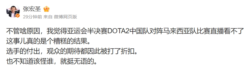 对此圈内名宿BBC(张宏圣)表示,不管什么原因,看不到这场中国队交手马来西亚的半决赛是一个糟糕的结果,选手的付出,观众的期待都因此被打了折扣。