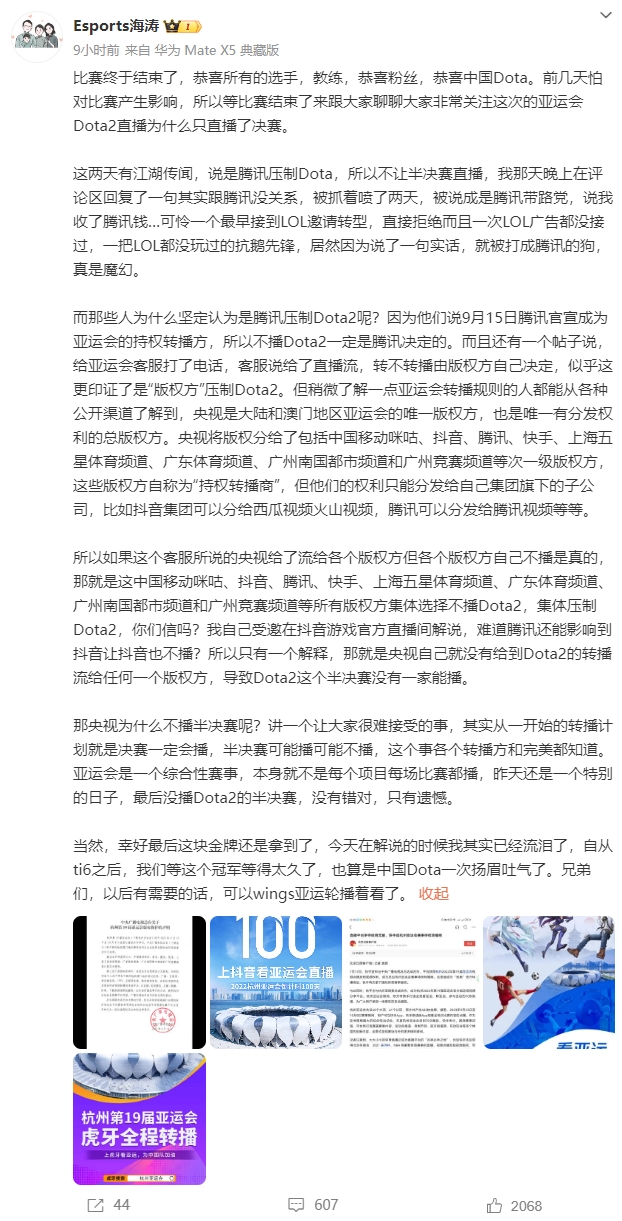 而那些人为什么坚定认为是腾讯压制Dota2呢?因为他们说9月15日腾讯官宣成为亚运会的持权转播方,所以不播Dota2一定是腾讯决定的。而且还有一个帖子说,给亚运会客服打了电话,客服说给了直播流,转不转播由版权方自己决定,似乎这更印证了是“版权方”压制Dota2。但稍微了解一点亚运会转播规则的人都能从各种公开渠道了解到,央视是大陆和澳门地区亚运会的唯一版权方,也是唯一有分发权利的总版权方。央视将版权分给了包括中国移动咪咕、抖音、腾讯、快手、上海五星体育频道、广东体育频道、广州南国都市频道和广州竞赛频道等次一级版权方,这些版权方自称为“持权转播商”,但他们的权利只能分发给自己集团旗下的子公司,比如抖音集团可以分给西瓜视频火山视频,腾讯可以分发给腾讯视频等等。