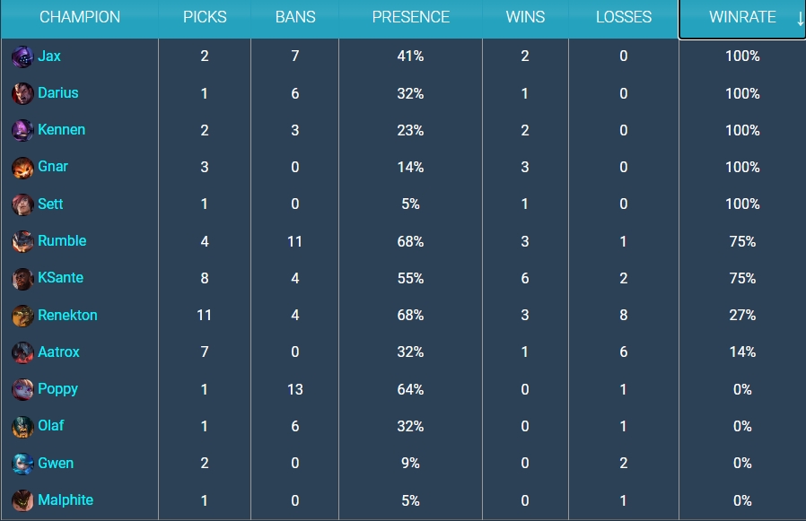 直播吧10月14日讯 S13全球总决赛入围赛前五日的比赛已经结束,根据数据网站显示,剑魔该英雄在这五日比赛内在上单位置中共出场七次;但仅有TW上单Sparda使用该英雄取胜一次。