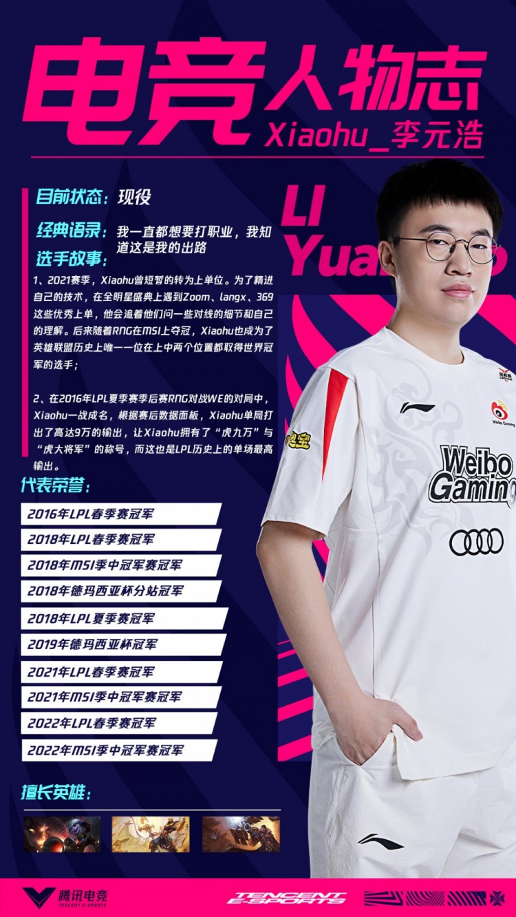 Xiaohu征战职业赛场多年,在多年的职业生涯中他曾打出过许许多多精彩亮眼的操作。2021赛季,他曾短暂的转为上单位选手随队征战赛场,凭借出色的发挥他成为了英雄联盟历史上唯一一位在上中两个位置都取得世界冠军的选手。他也曾单场打出过高达9万的输出,拥有了“虎九万”与“虎大将军”的称号。